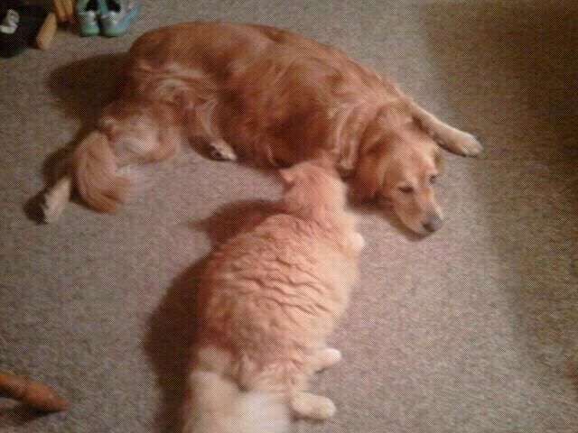 I can't say Sweet Pea and Maggie are best friends. But they do tolerate each other. When Maggie wants to play, Sweet Pea just smacks her in the face a few times till Mag gets the idea that the cat's just not into playing. S.P. will lay with Mag or lick her fur, but its on her terms and in her own time.